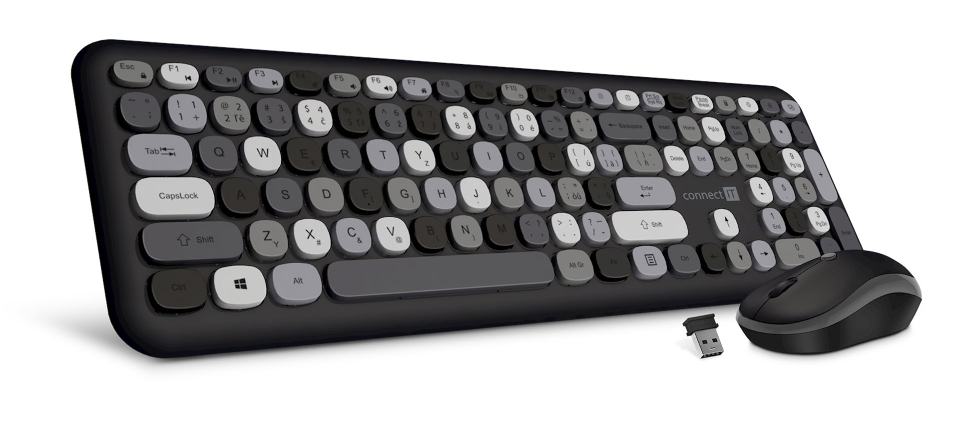 Bezdrátová klávesnice a optická myš s klávesami v šedo-černých odstínech je ideální kombinace počítačového příslušenství, které si můžete vzít s sebou domů či do práce.